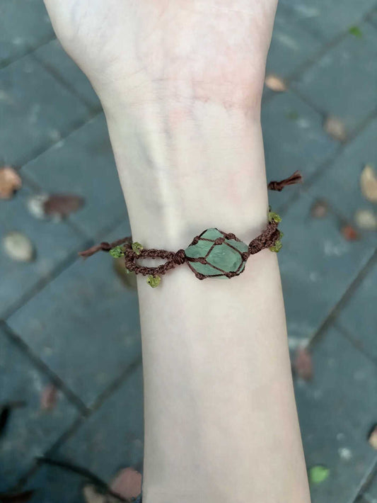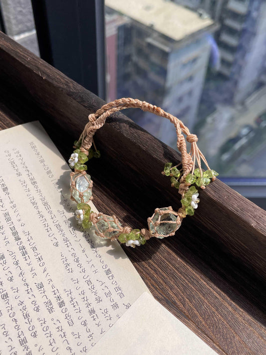 ミントフォレスト風マクラメブレスレット|天然オリーブ石×水晶 手作り