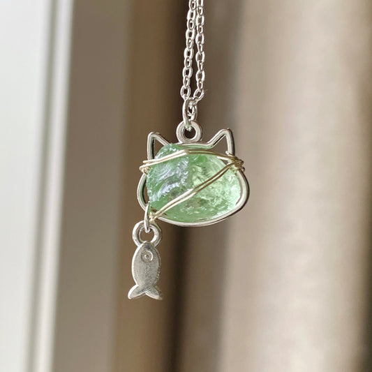 海のきらめき アクアマリン原石×猫と魚のワイヤーアートネックレス|ハンドメイドギフト