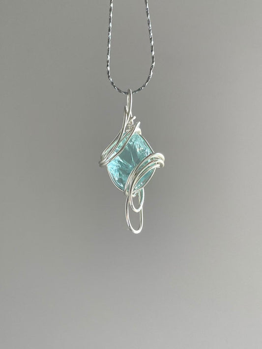 仙本那ブルーガラス原石ネックレス|手作りワイヤー×チタン合金