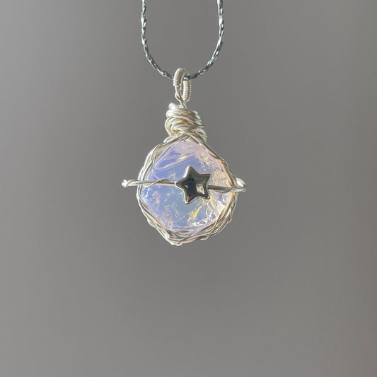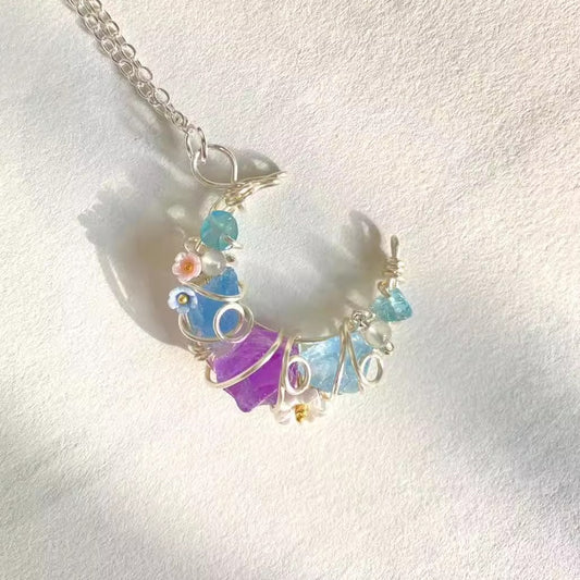 月モチーフ天然水晶ネックレス|手作りワイヤーペンダント ロングチェーン