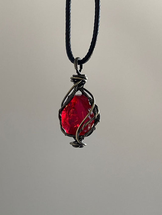 ガーネット風レッド水晶×ガラス 手作りシンプルペンダント