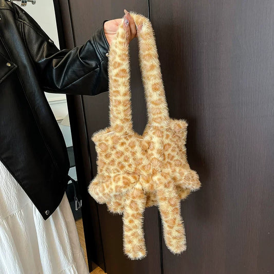 トレンド大容量ファーバッグ秋冬ヒョウ柄リボン付きショルダー