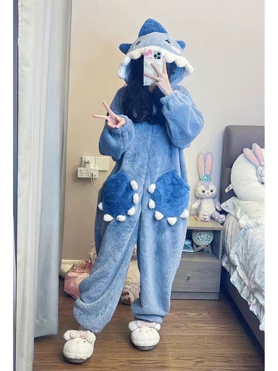 Shark-themed fluffy hooded pajamas