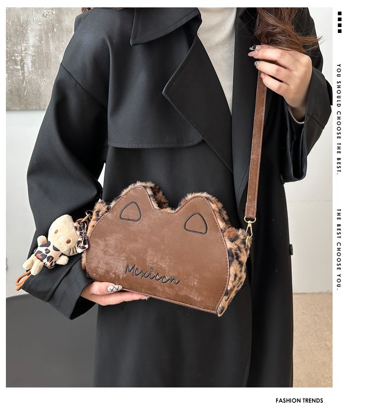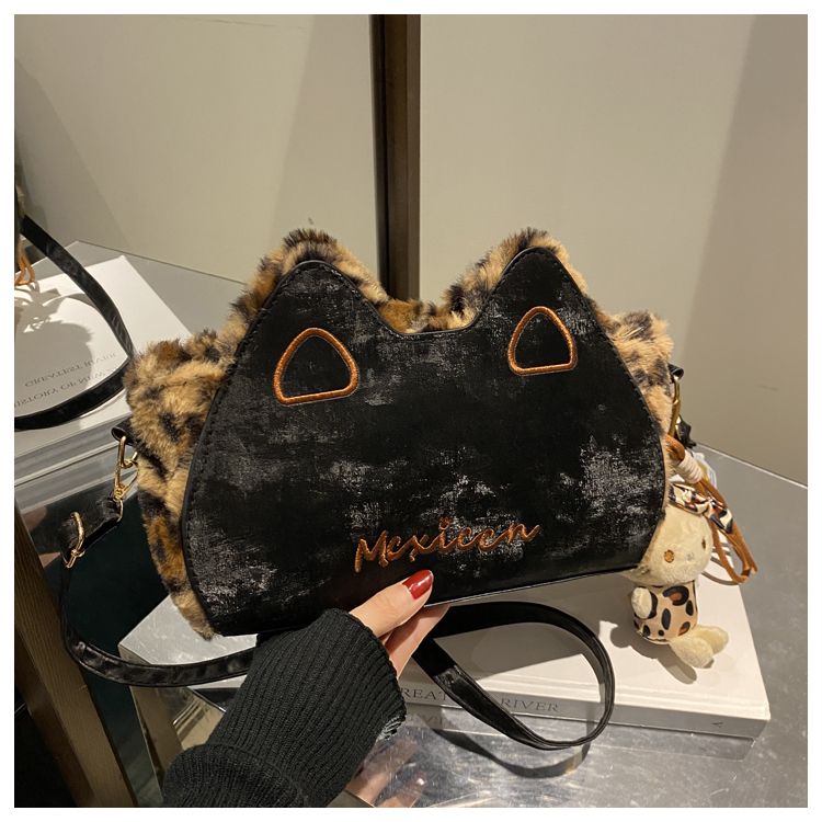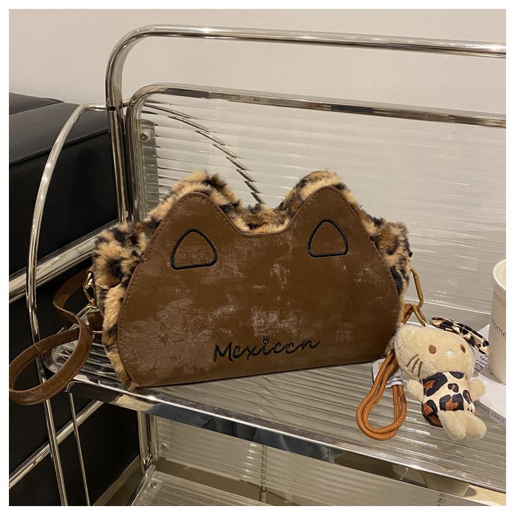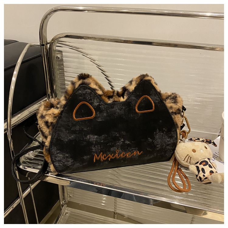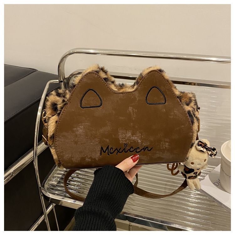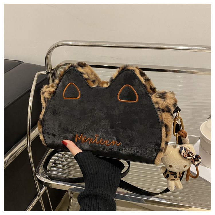 Fluffy shoulder bag with leopard ears | Cute irregular-shaped bag for autumn and winter