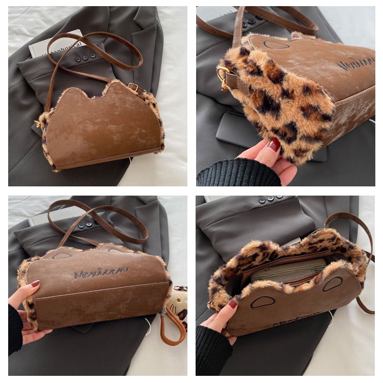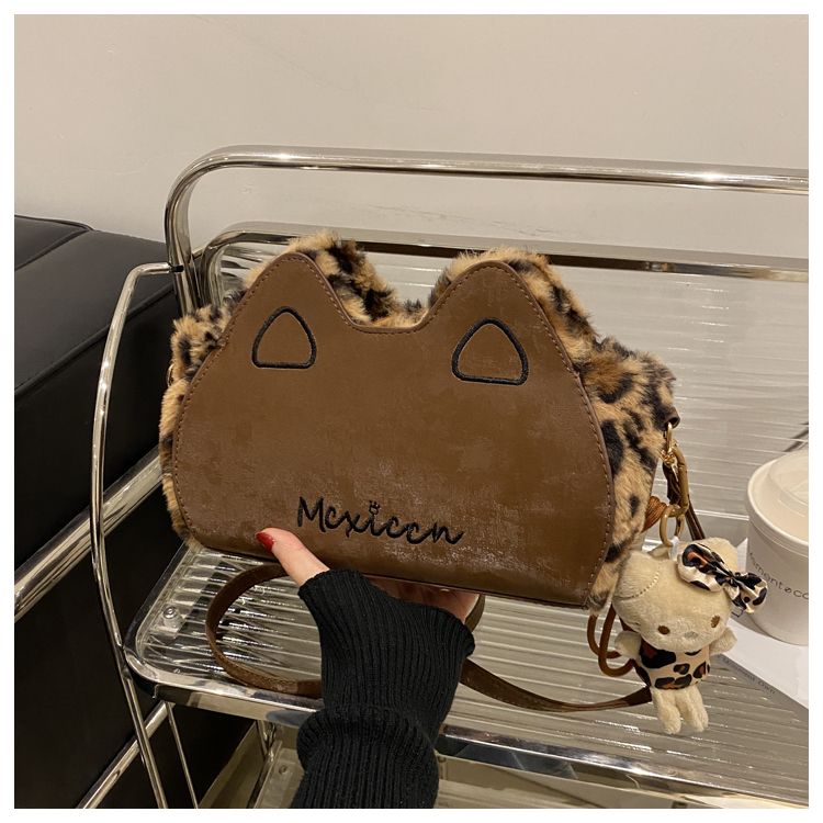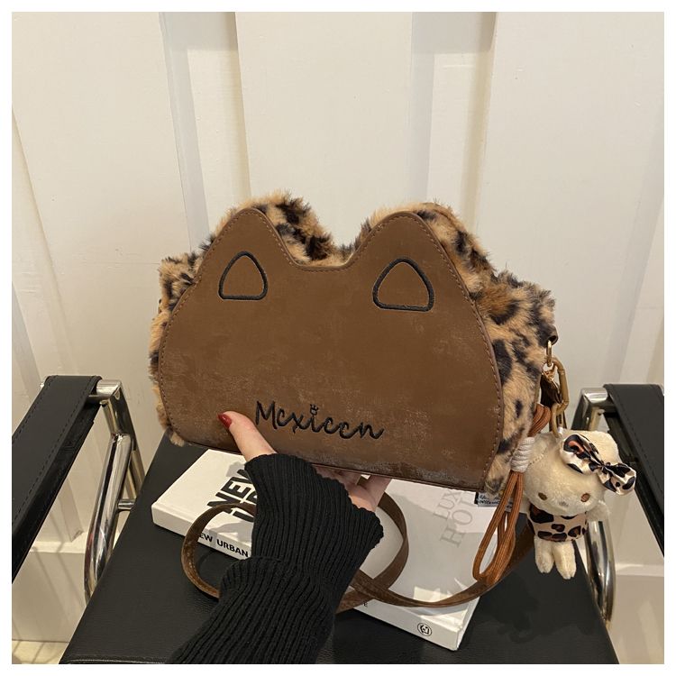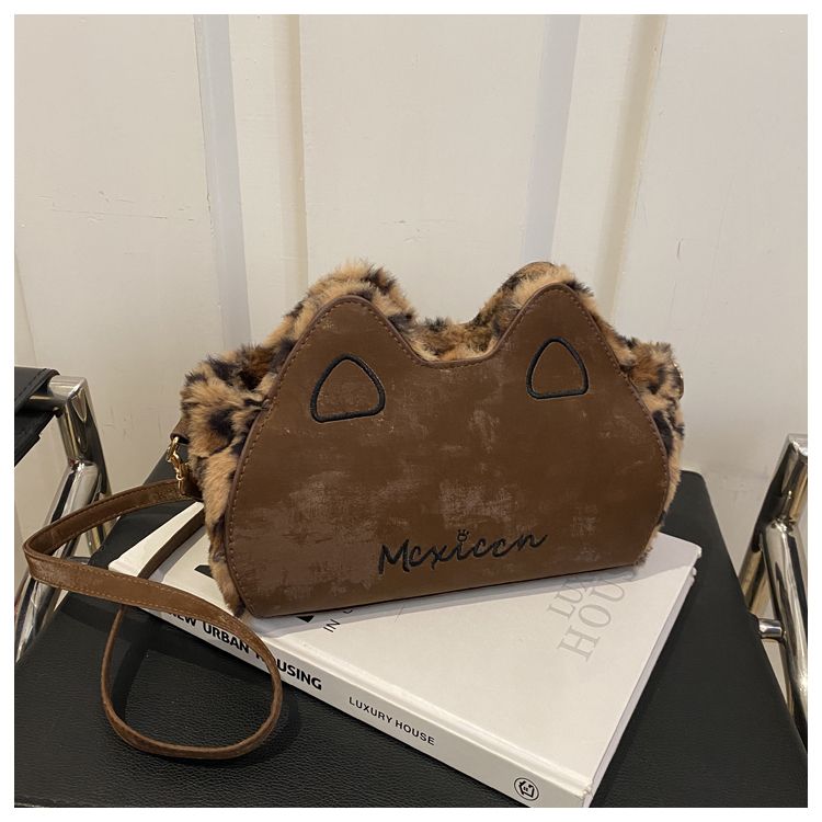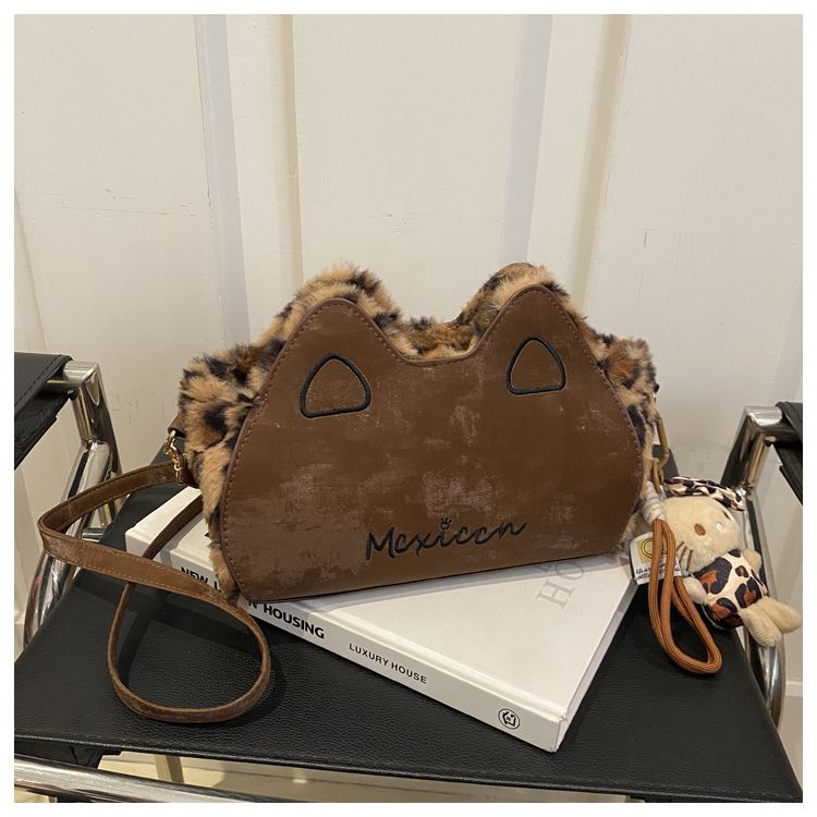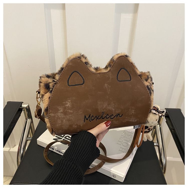 Fluffy shoulder bag with leopard ears | Cute irregular-shaped bag for autumn and winter