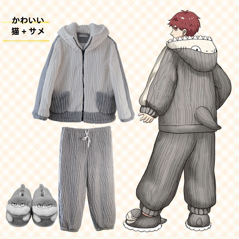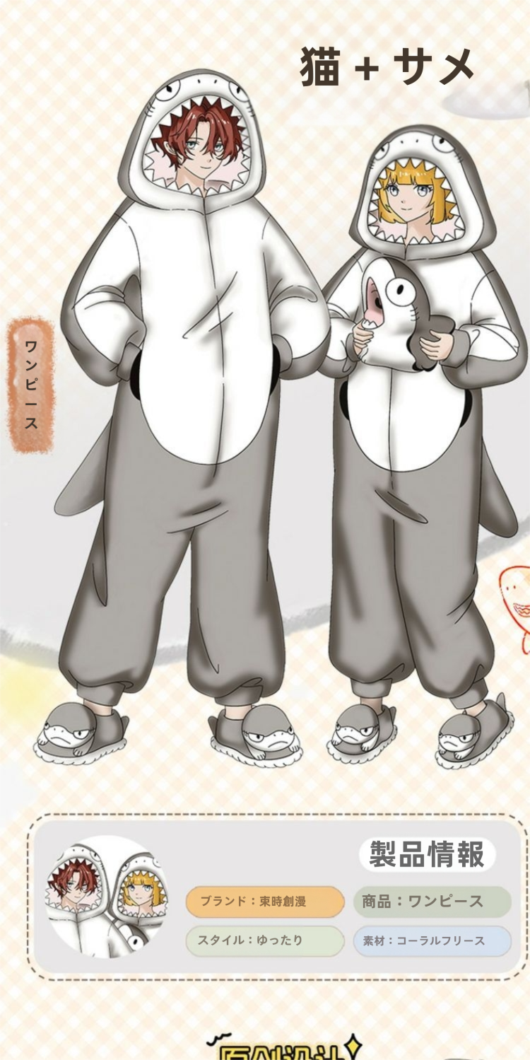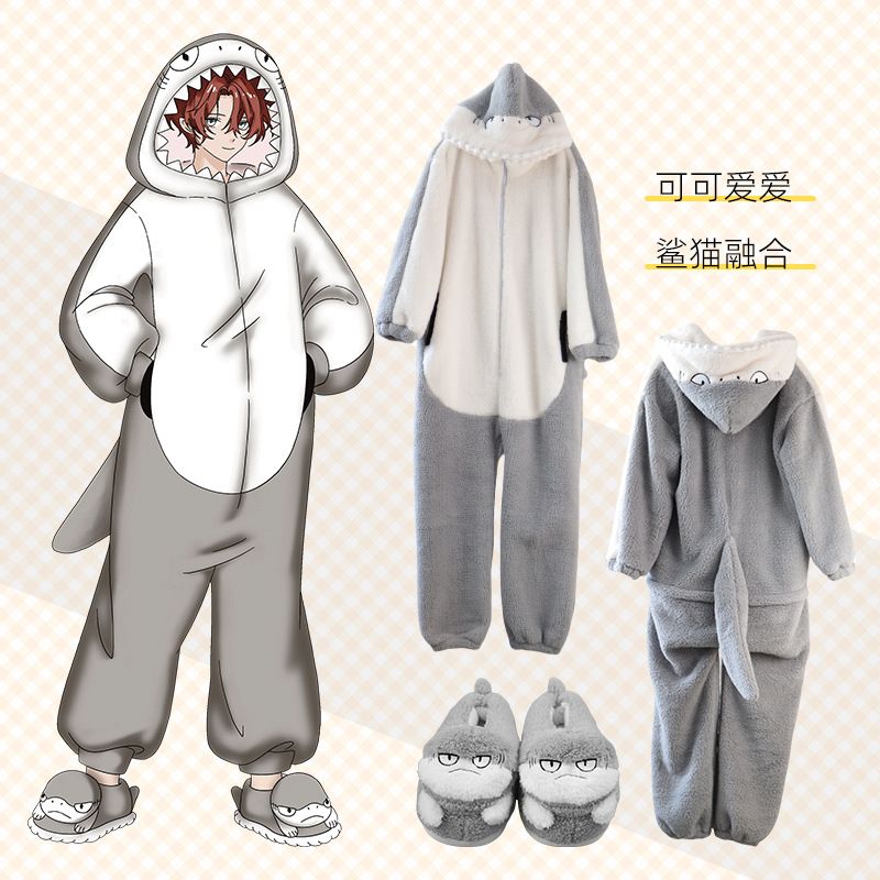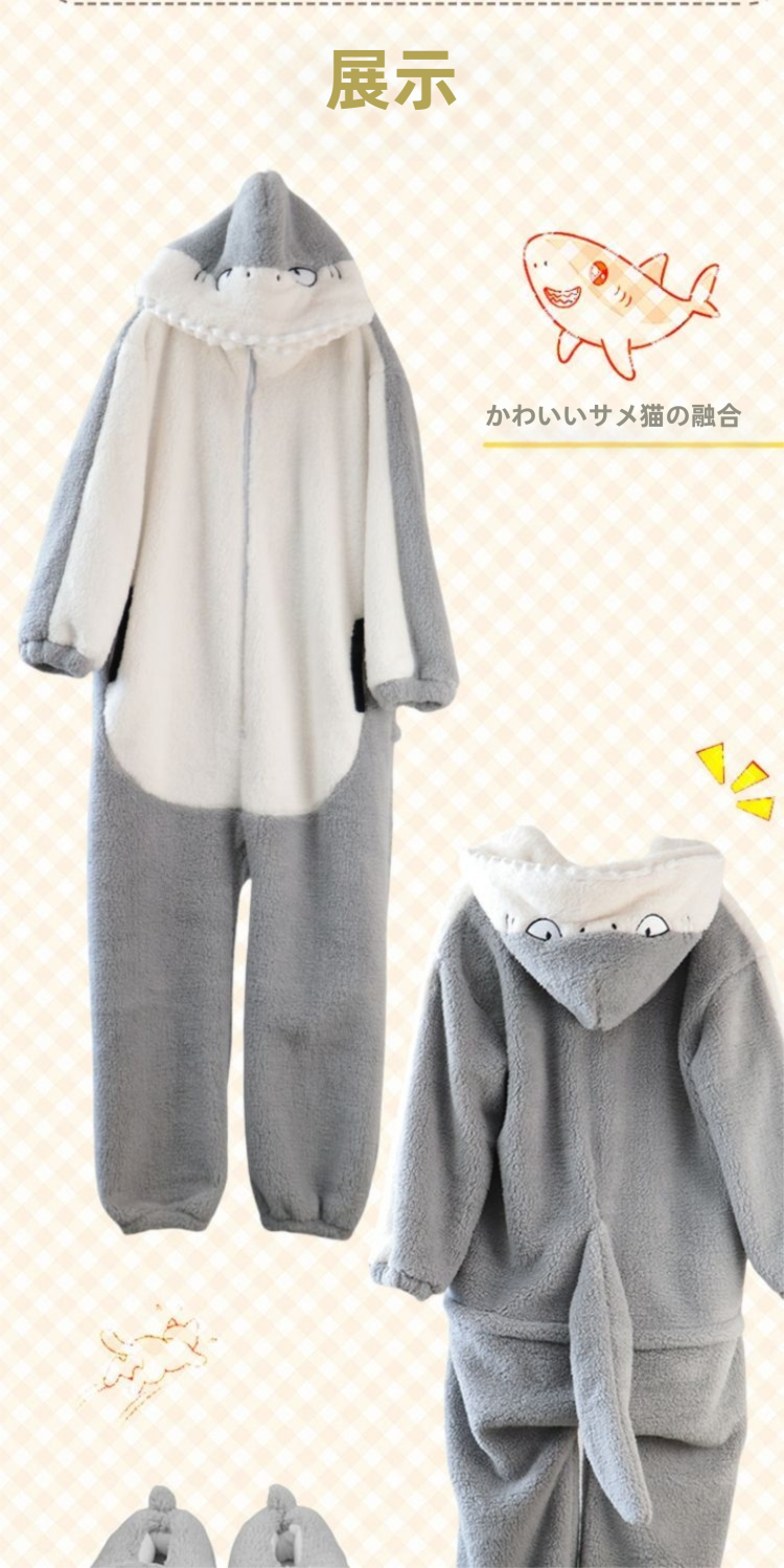 サメ&ネコ変身のおもしろ連体パジャマ/ペアルックのあったか連体ルームウェア