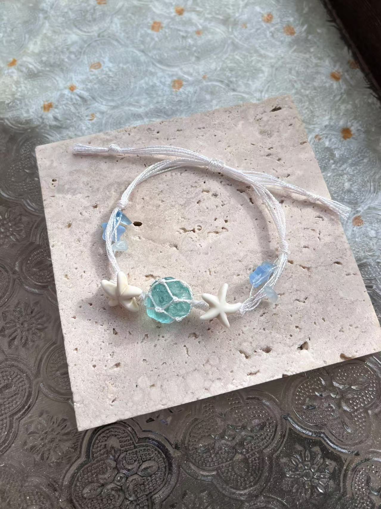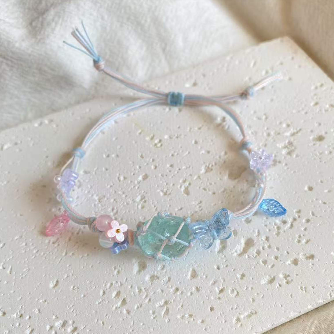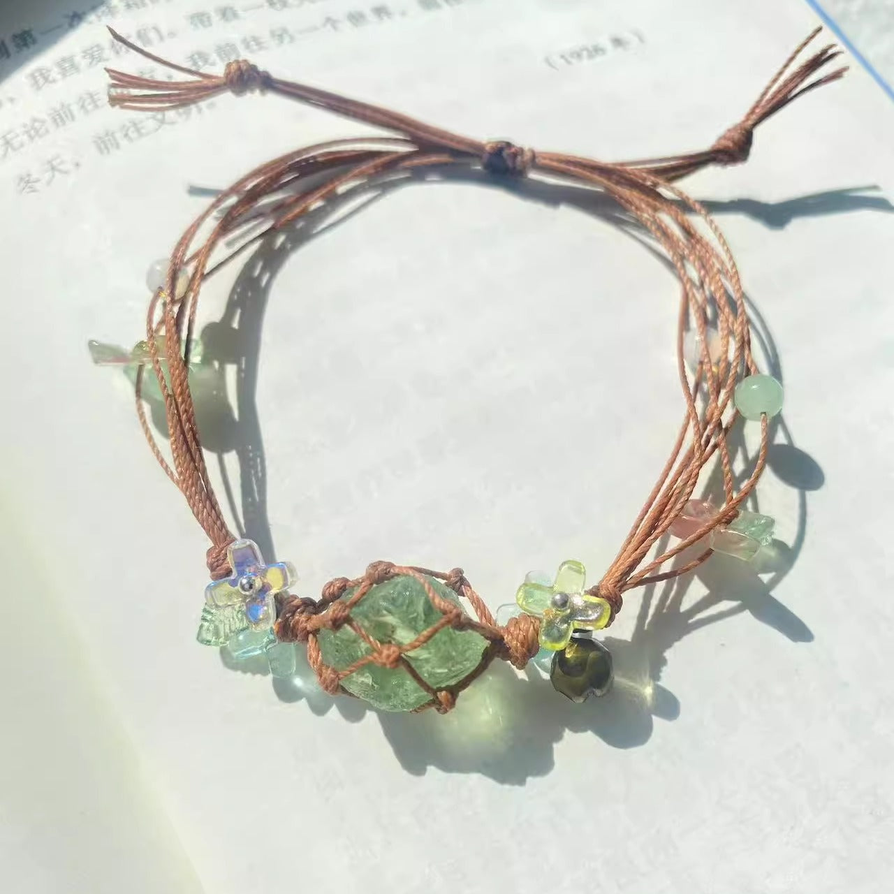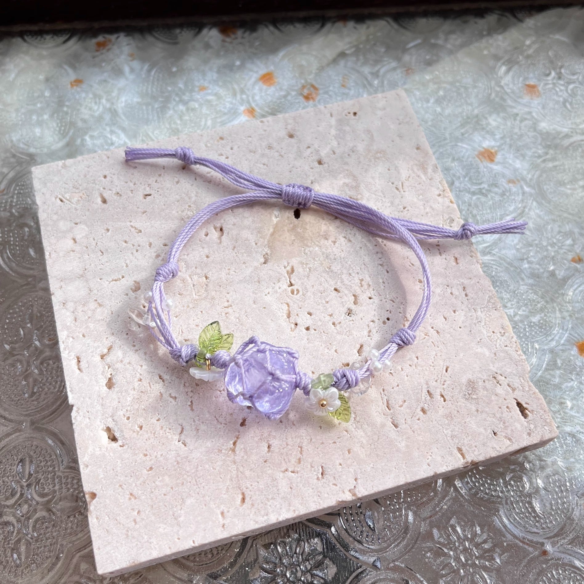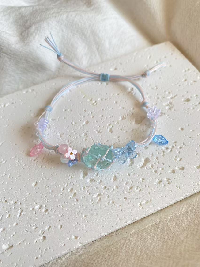 森の静けさと海の透明感をイメージしたアクアマリンとアメジストの手作りマクラメブレスレット。癒しと落ち着きを届ける編みアクセサリー。