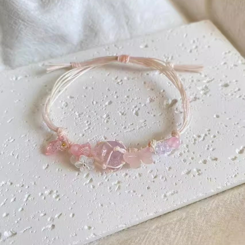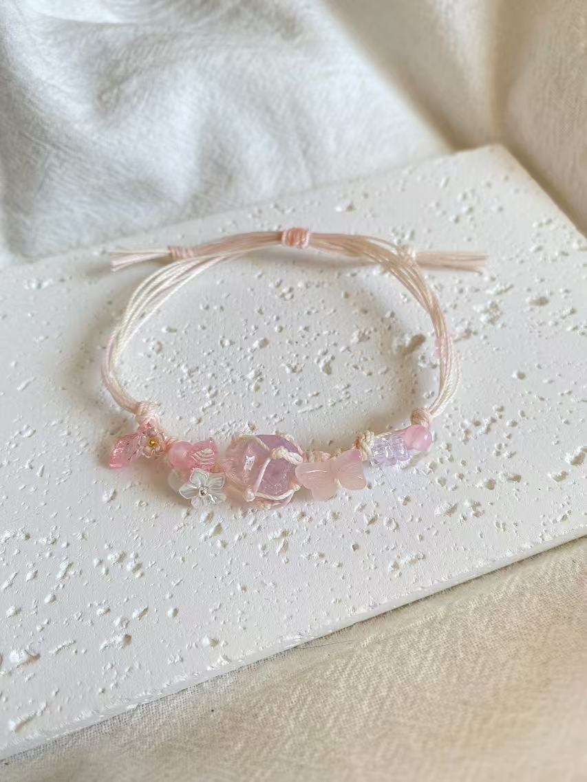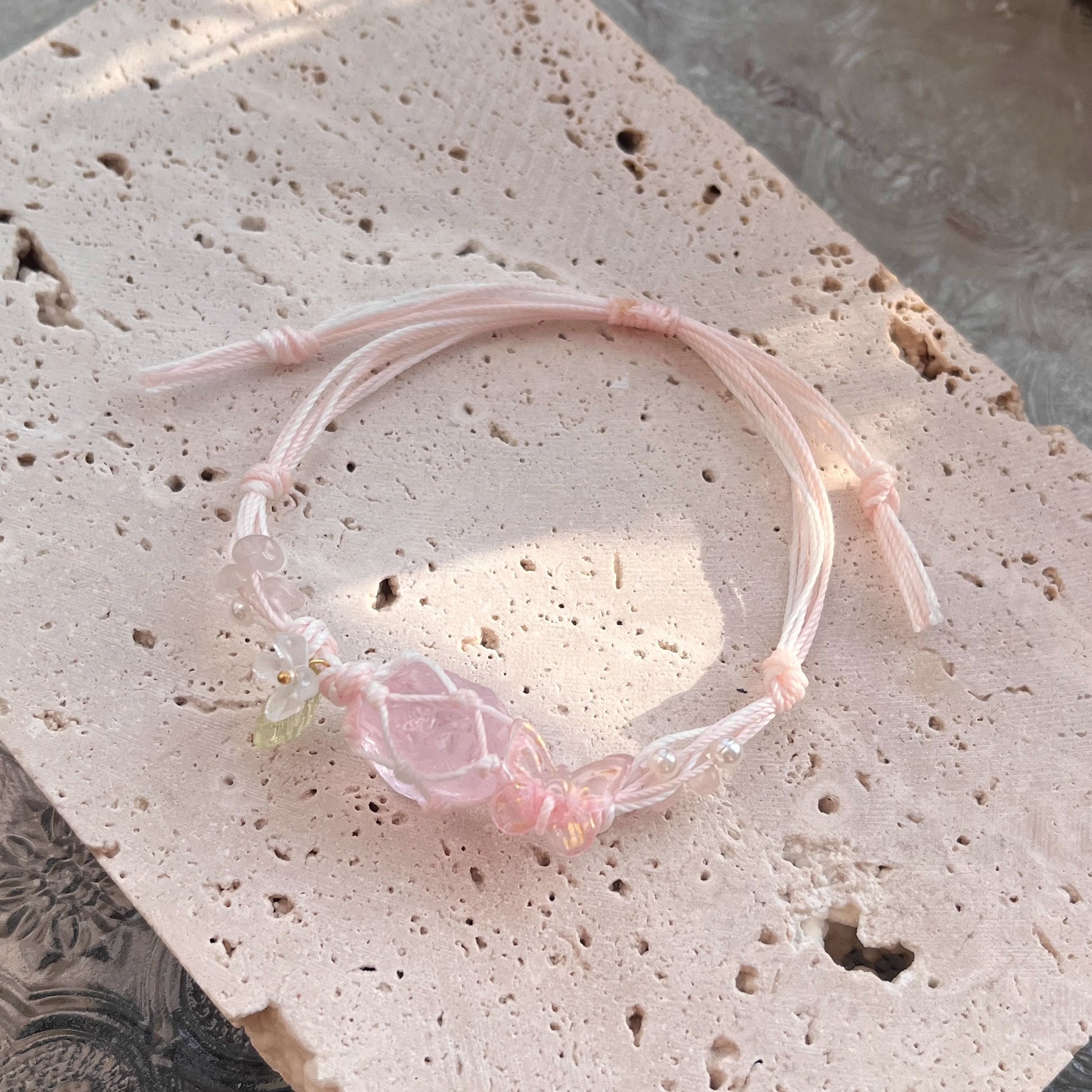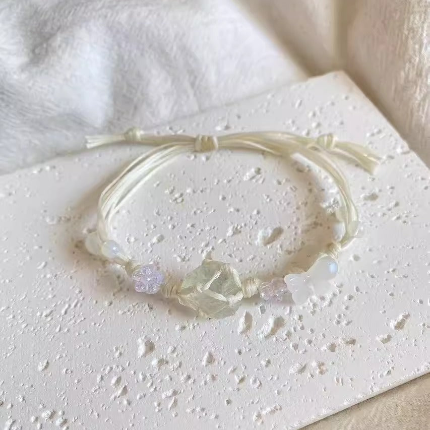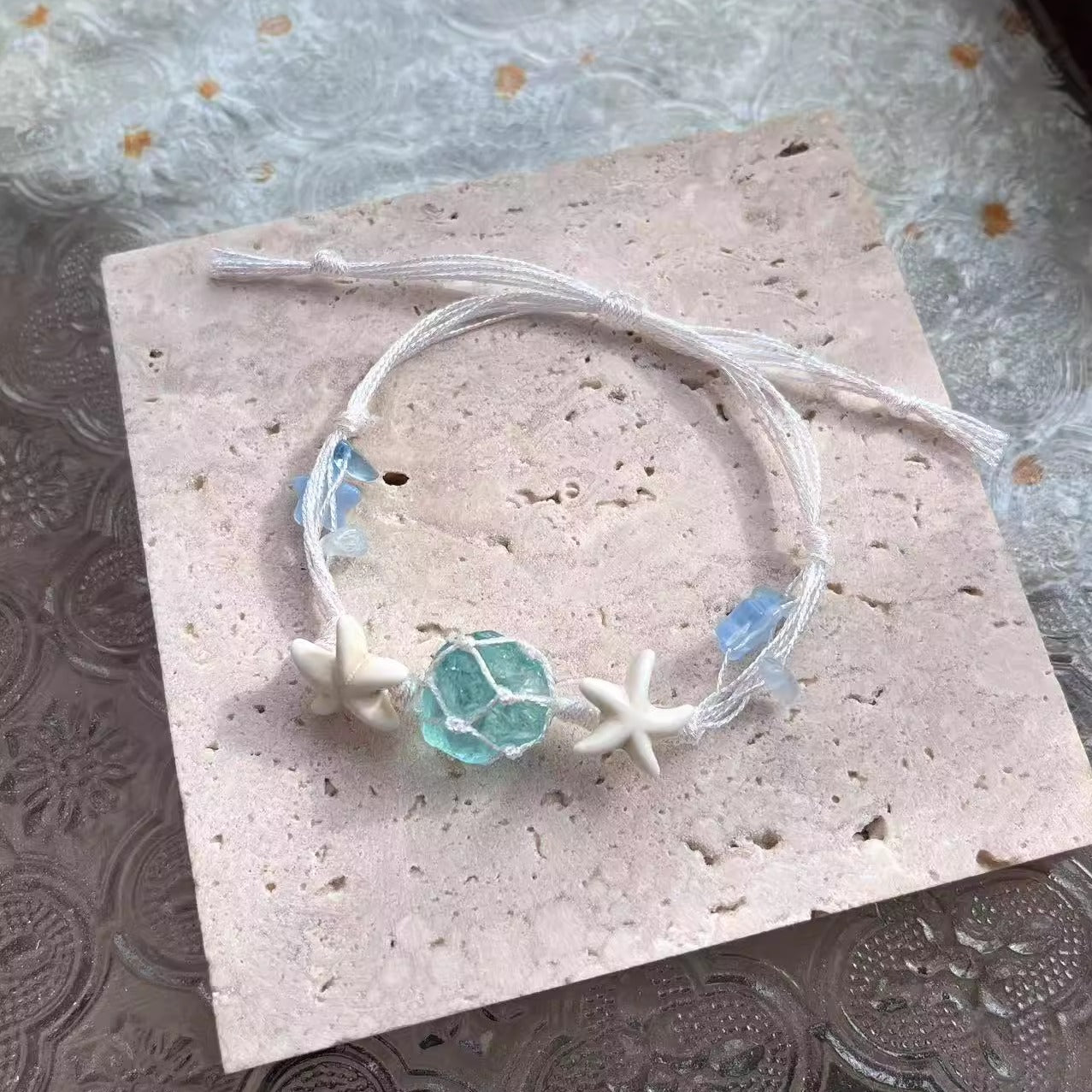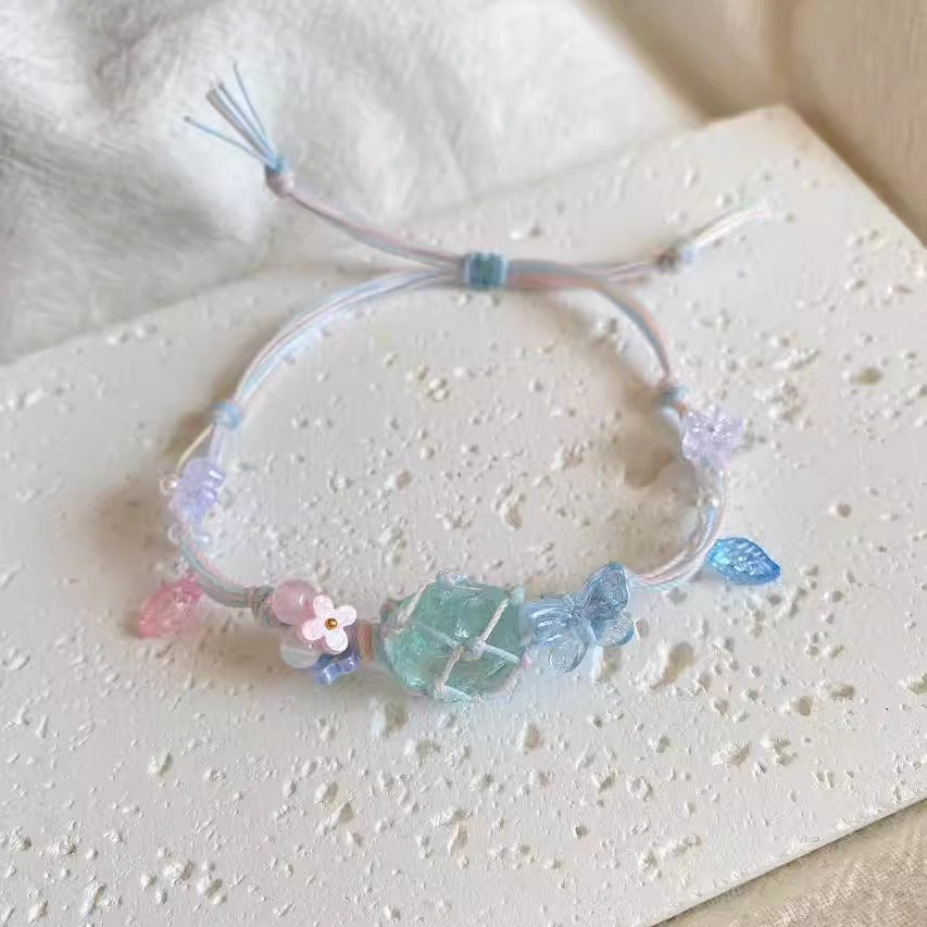 森の静けさと海の透明感をイメージしたアクアマリンとアメジストの手作りマクラメブレスレット。癒しと落ち着きを届ける編みアクセサリー。