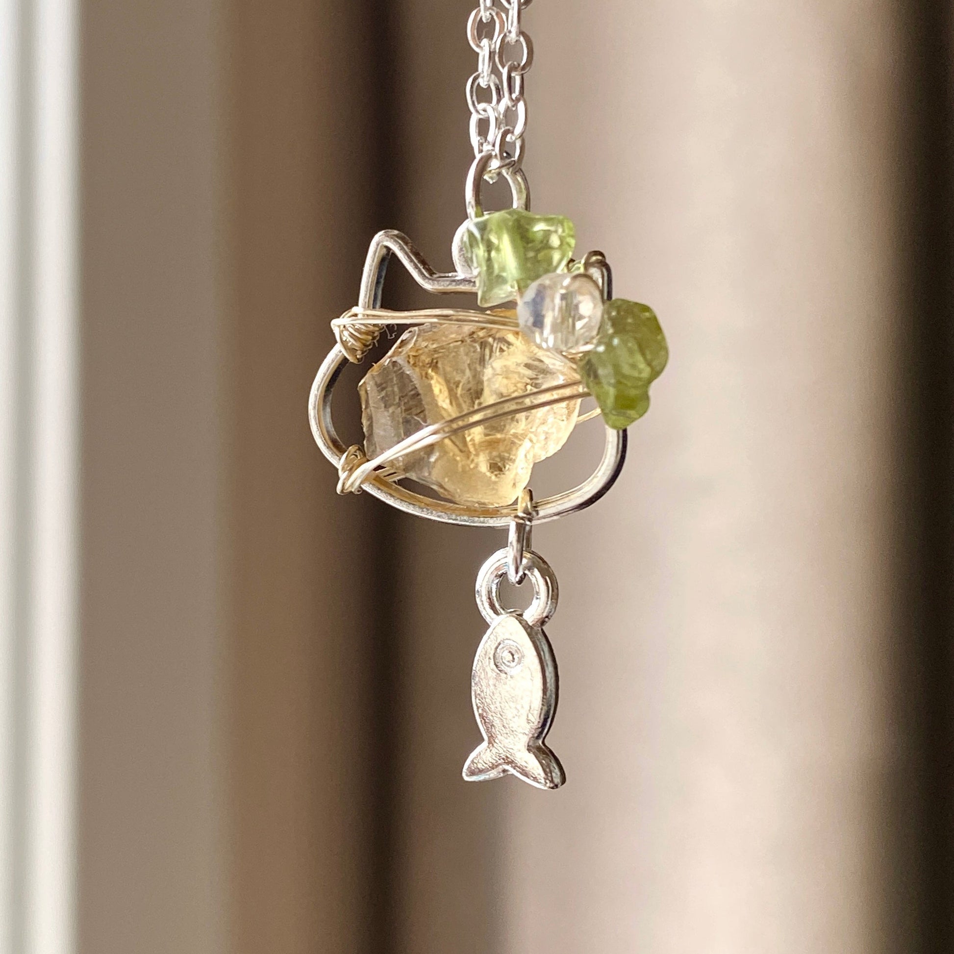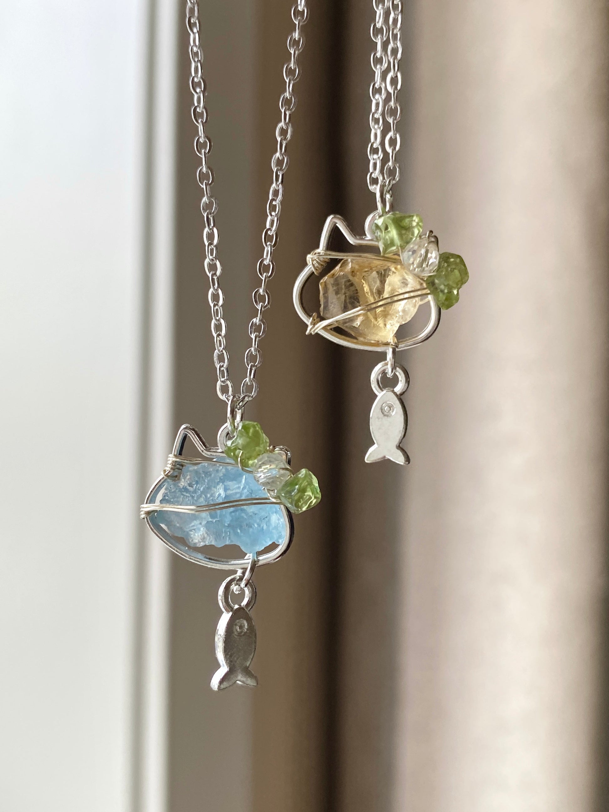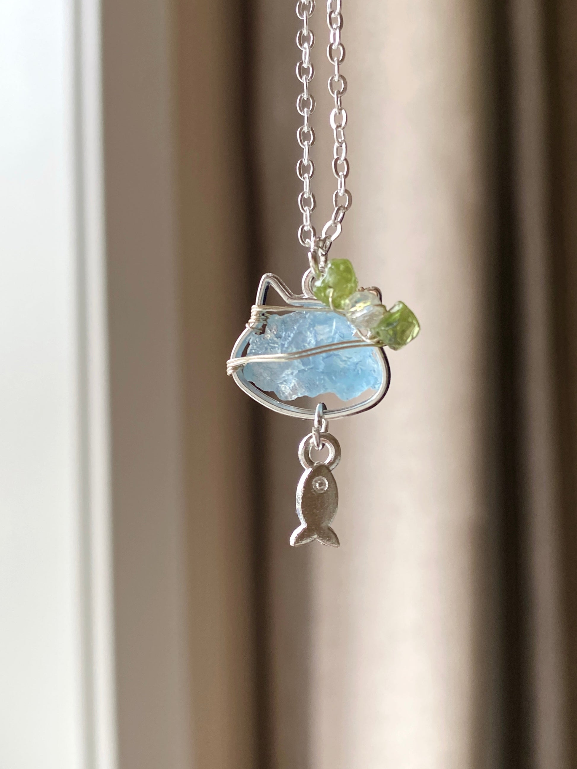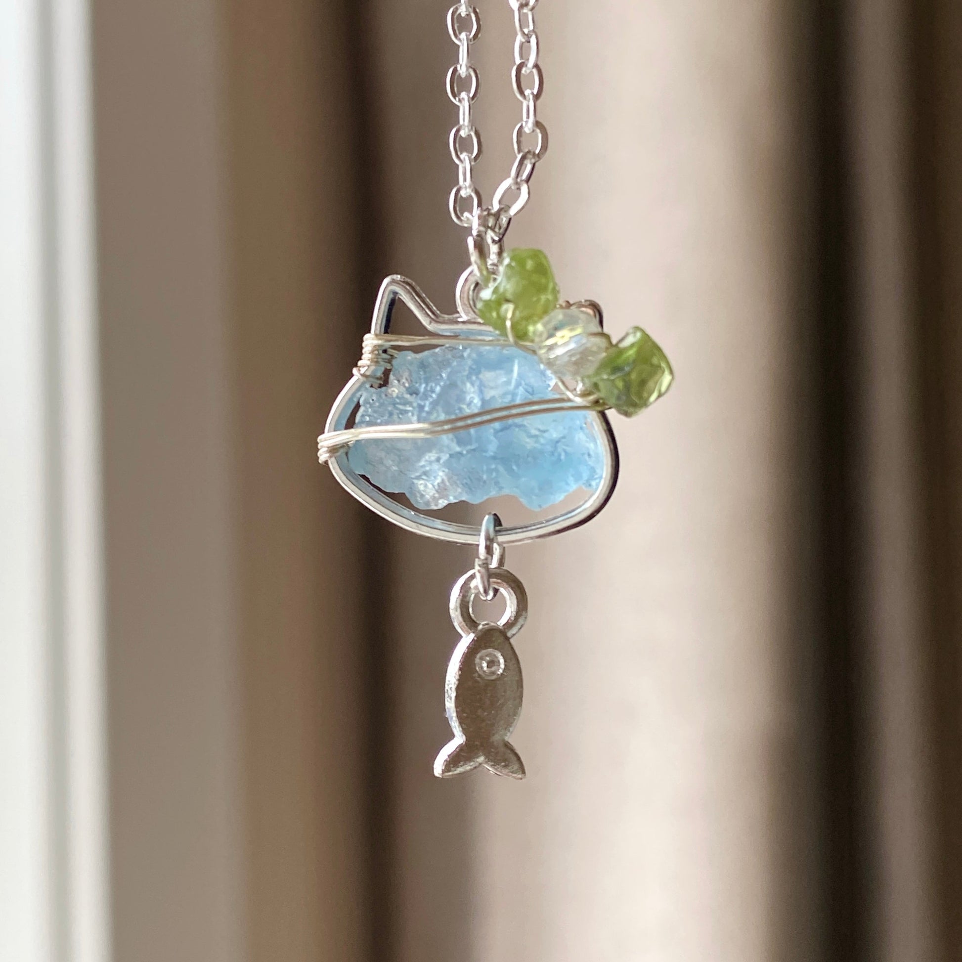 海のきらめき アクアマリン原石×猫と魚のワイヤーアートネックレス|ハンドメイドギフト