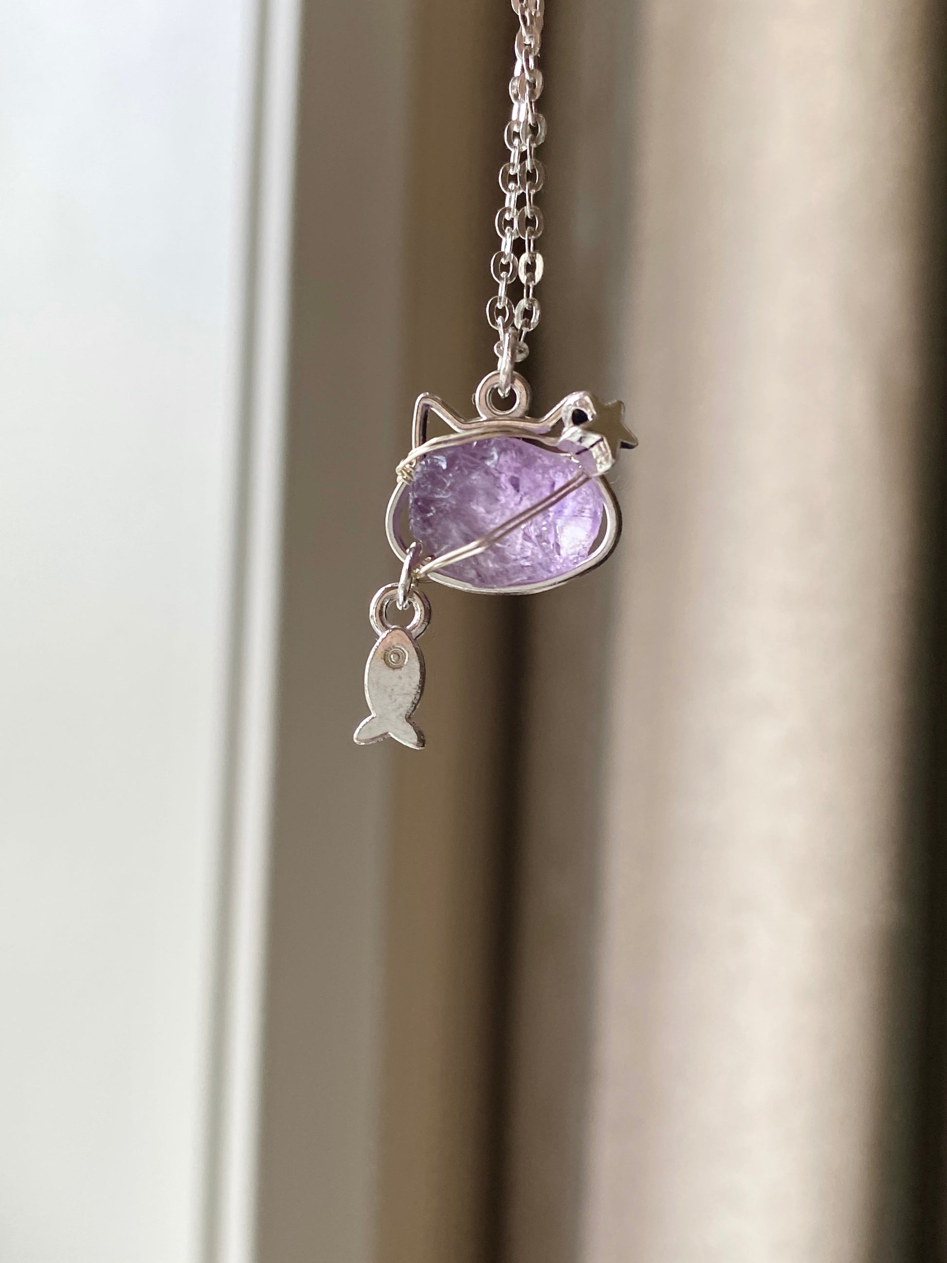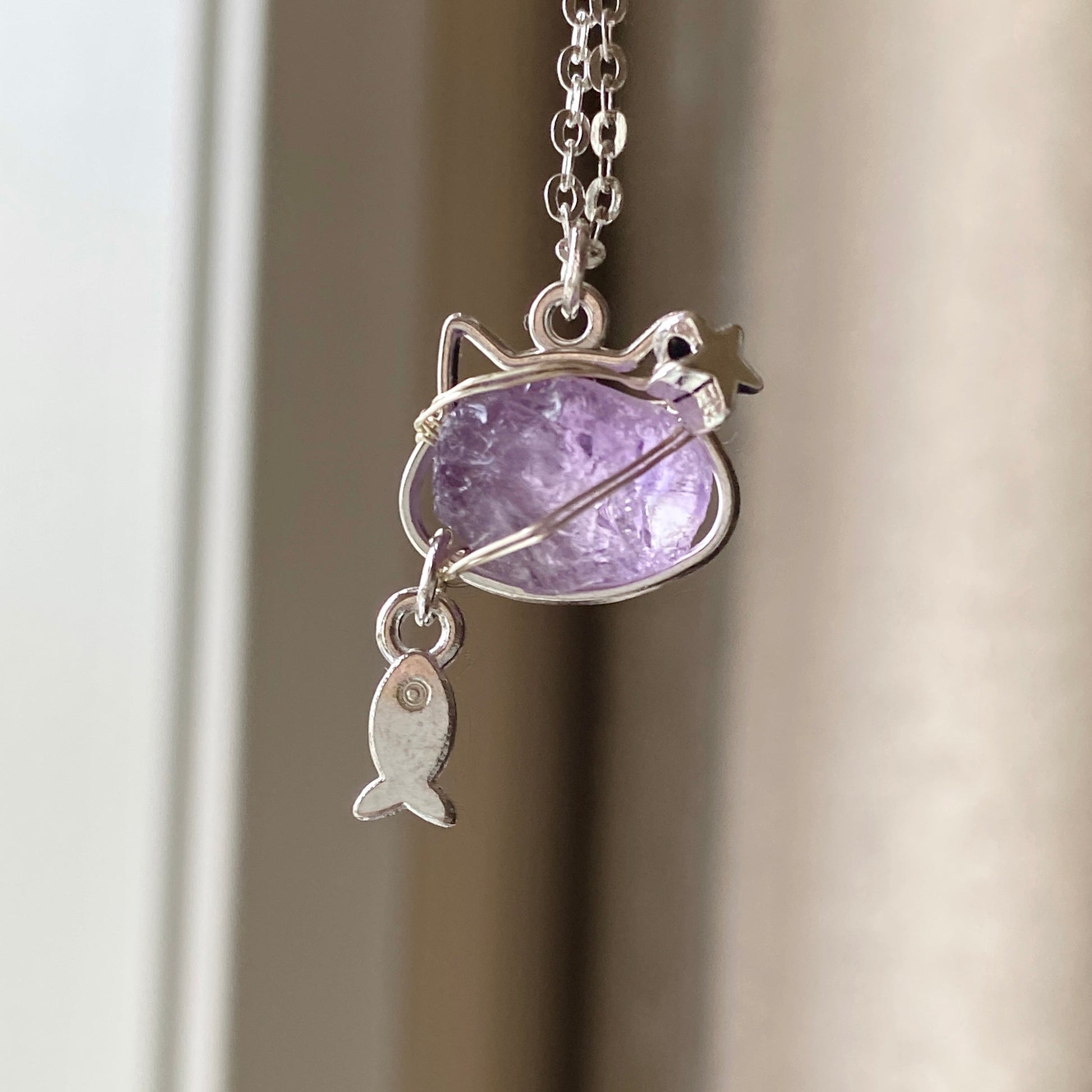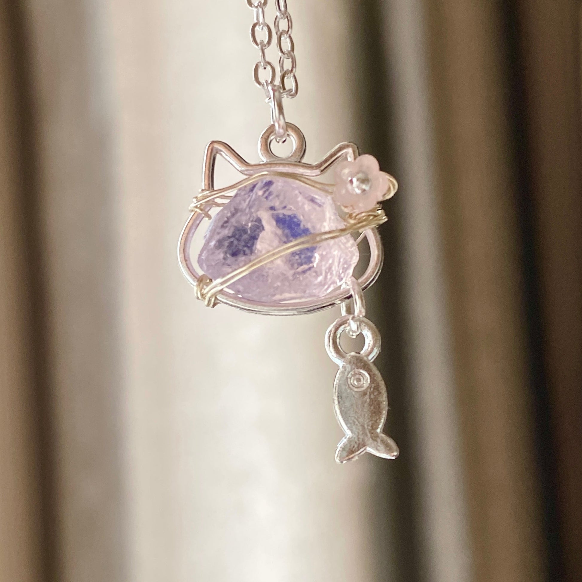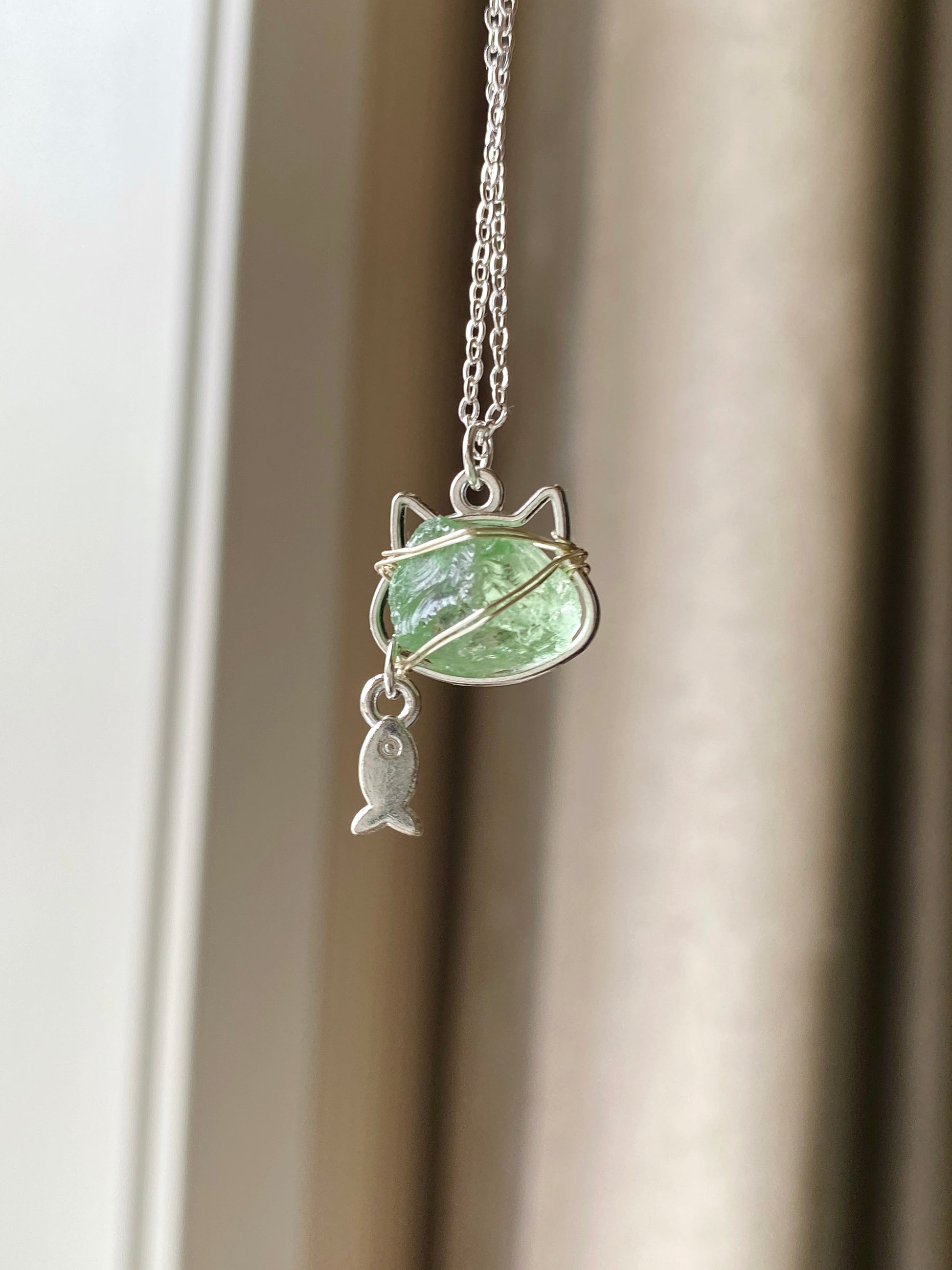 海のきらめき アクアマリン原石×猫と魚のワイヤーアートネックレス|ハンドメイドギフト