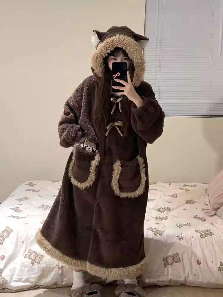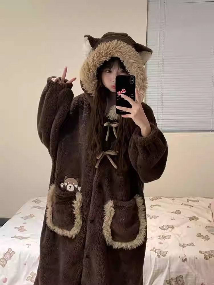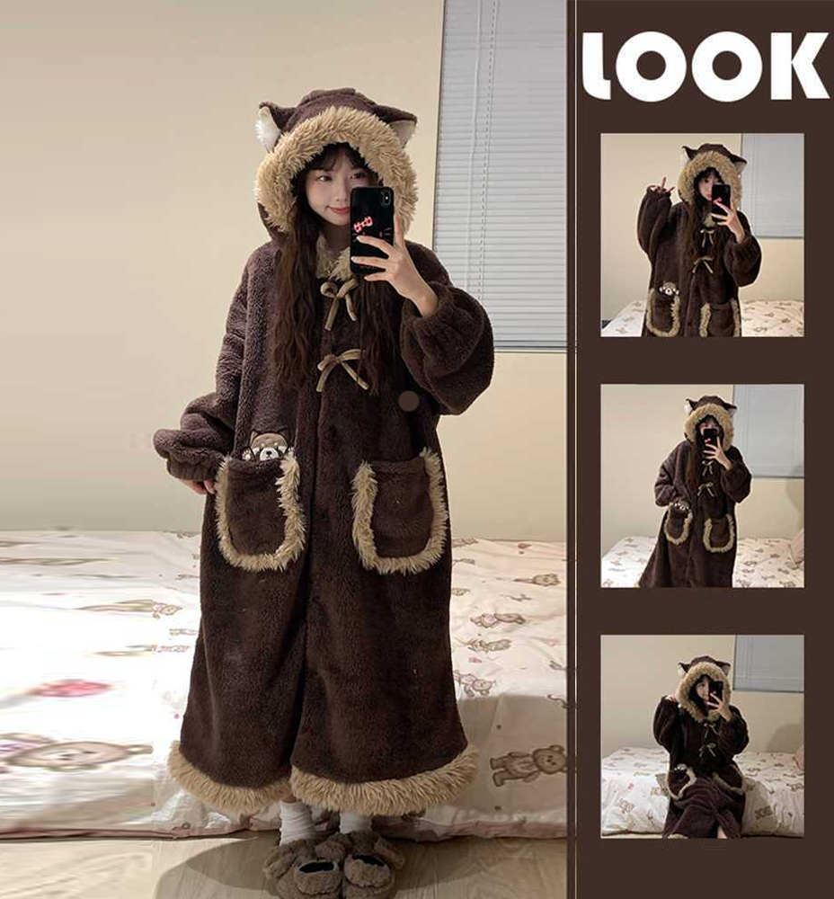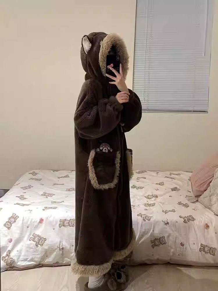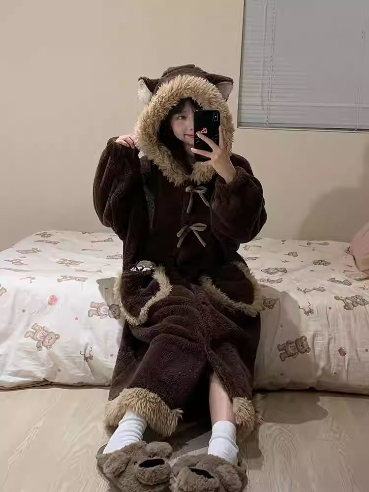 クマのモコモコフード付きガウン&パジャマセット / とろける触感の可愛いルームウェア