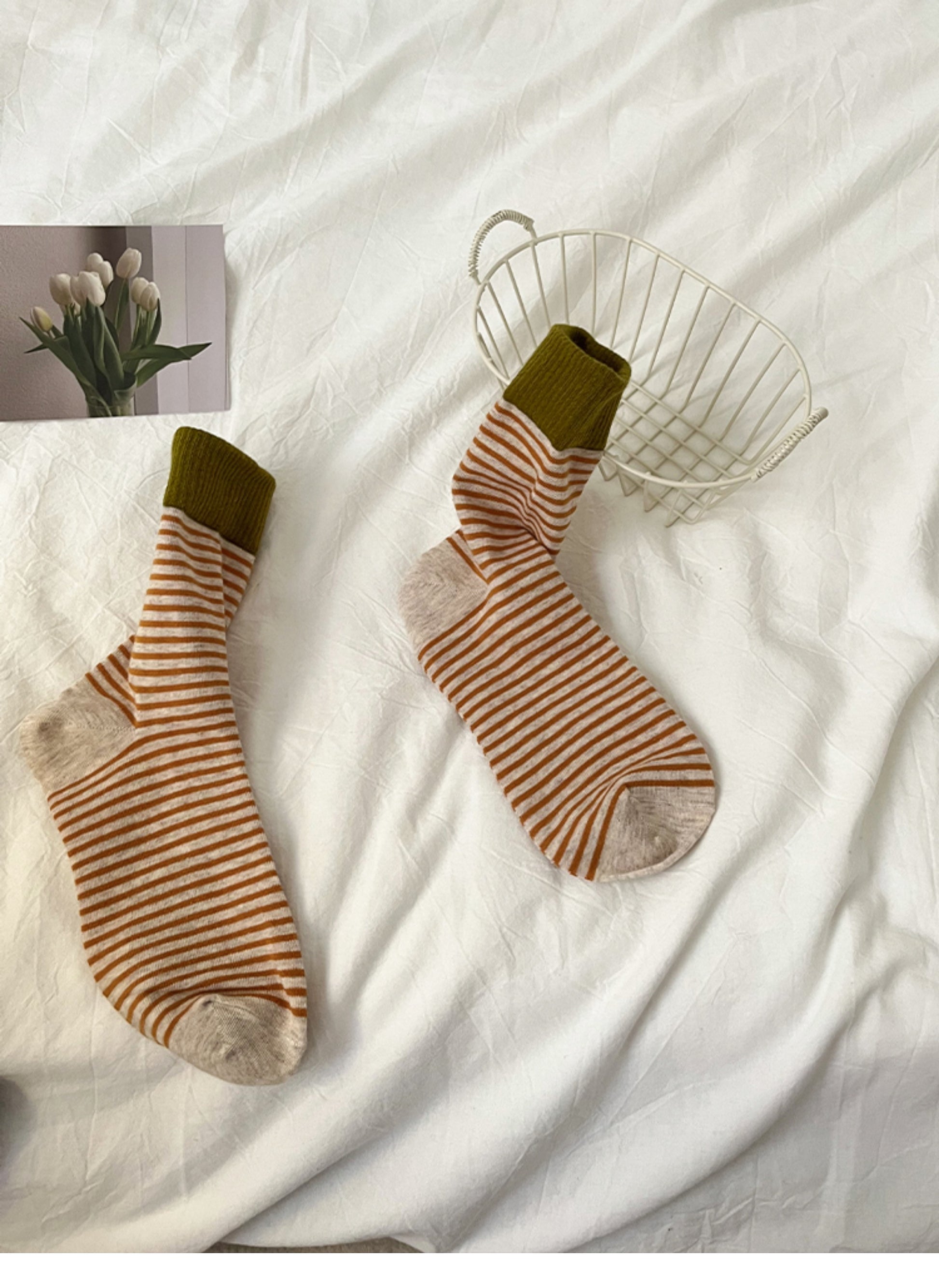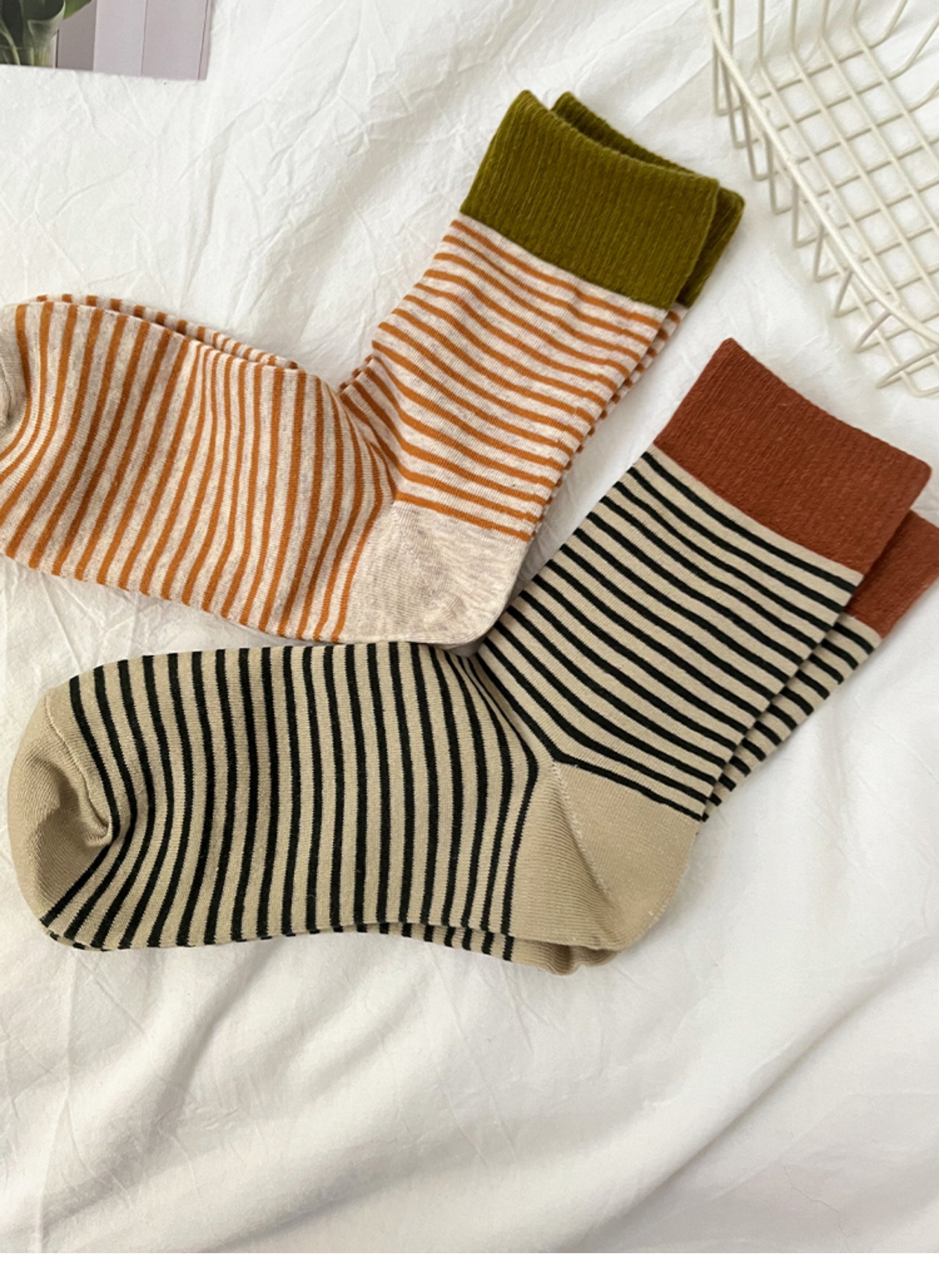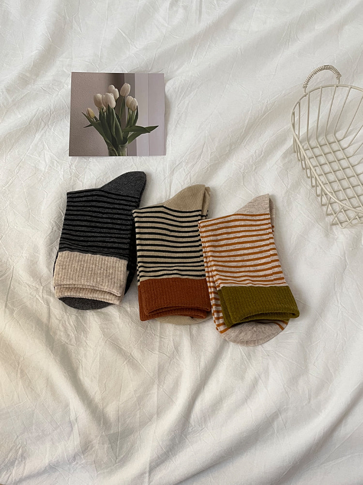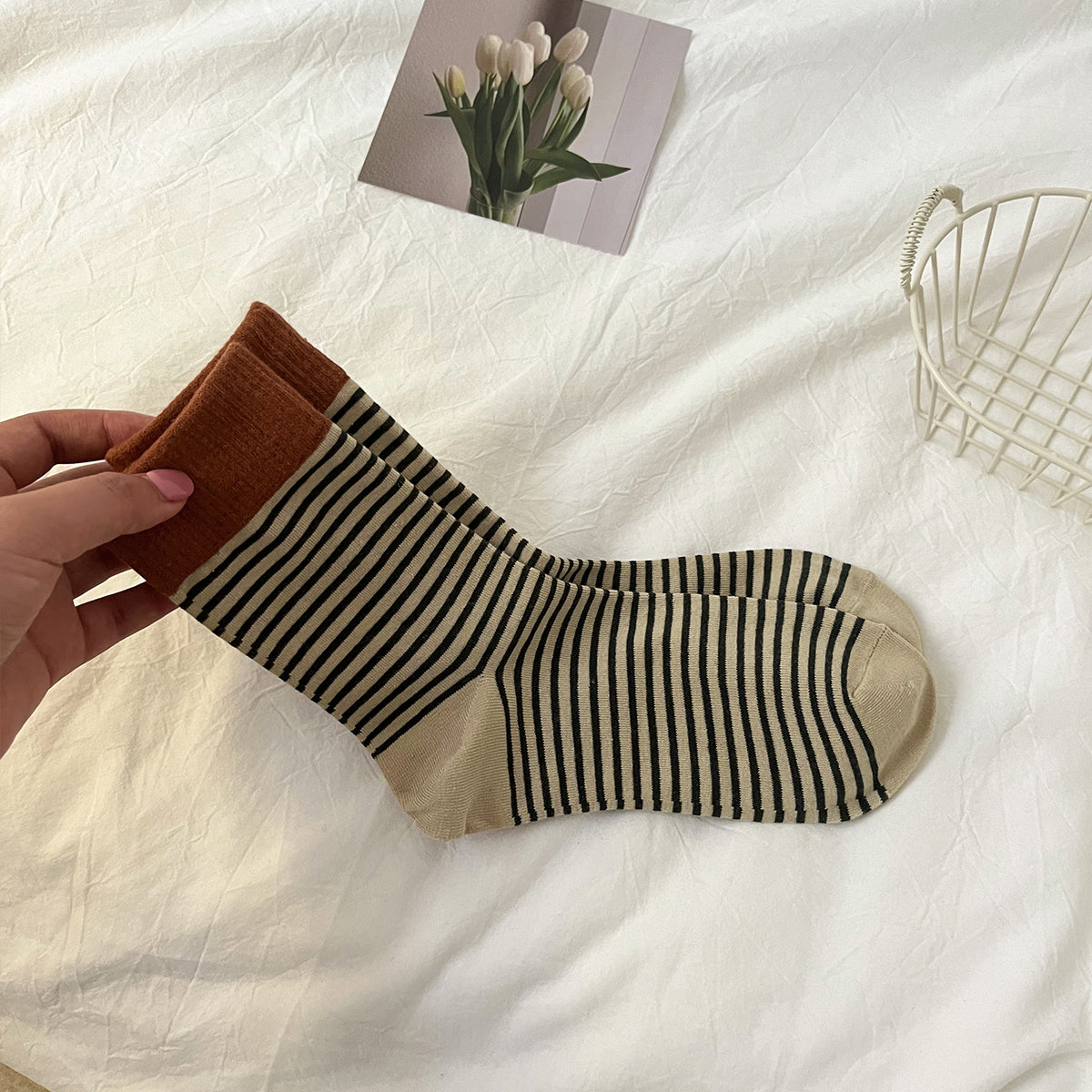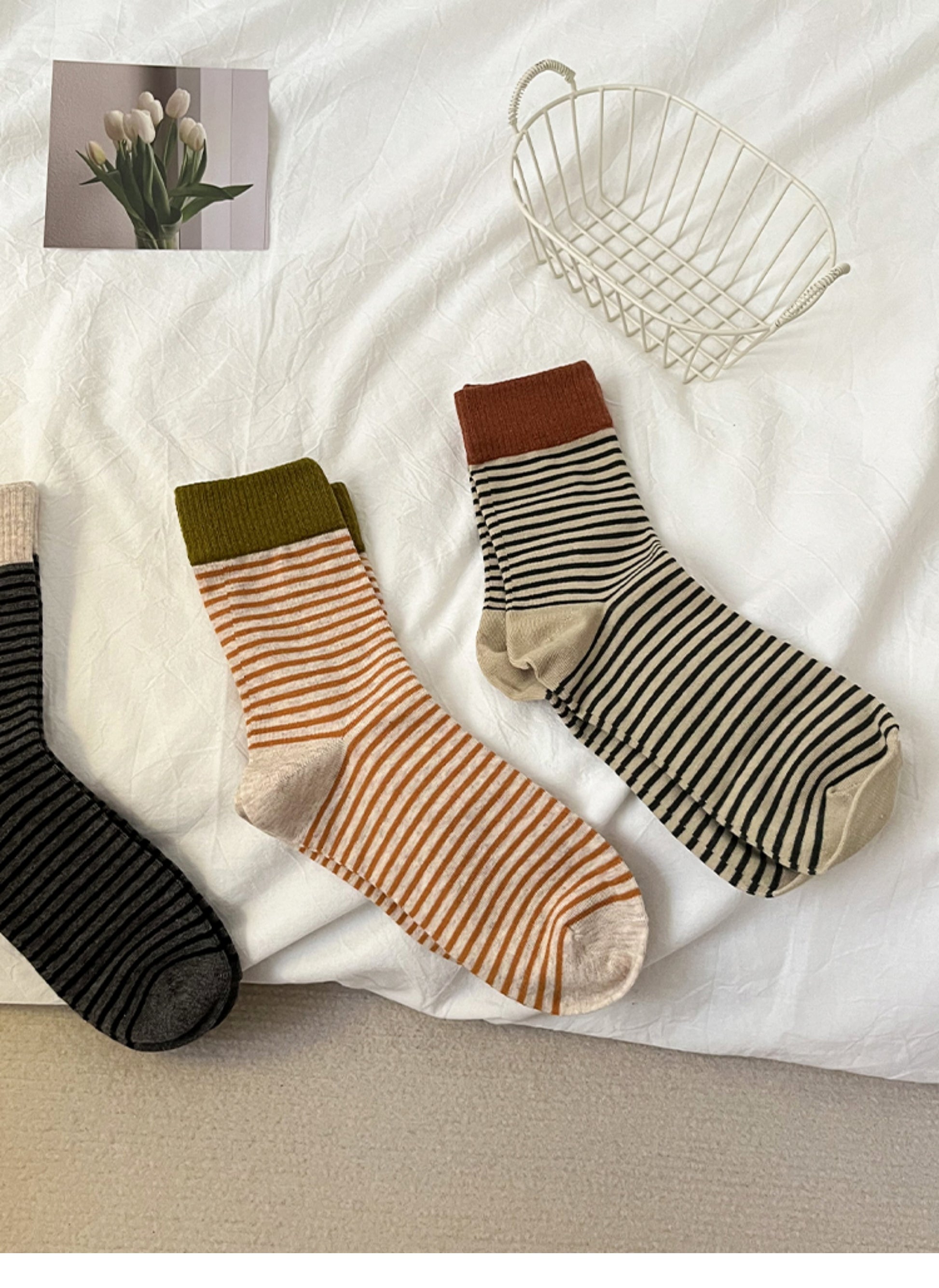韓国風ヴィンテージ配色ソックス|綿素材の中筒靴下・通学にも◎