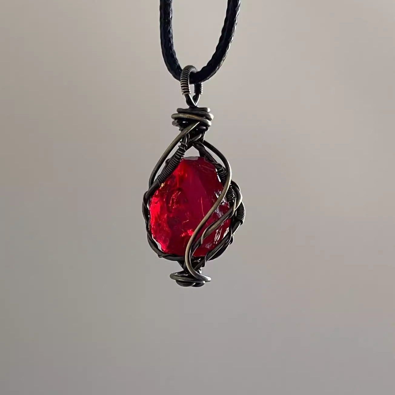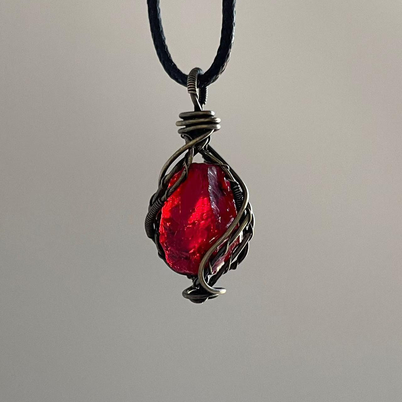 ガーネット風レッド水晶×ガラス 手作りシンプルペンダント