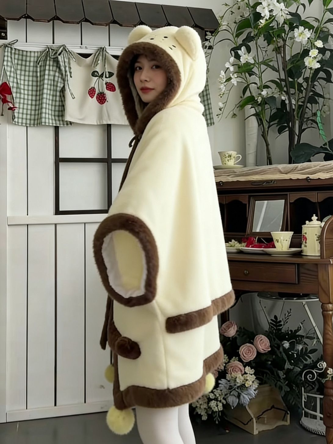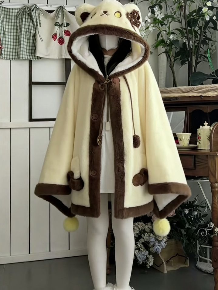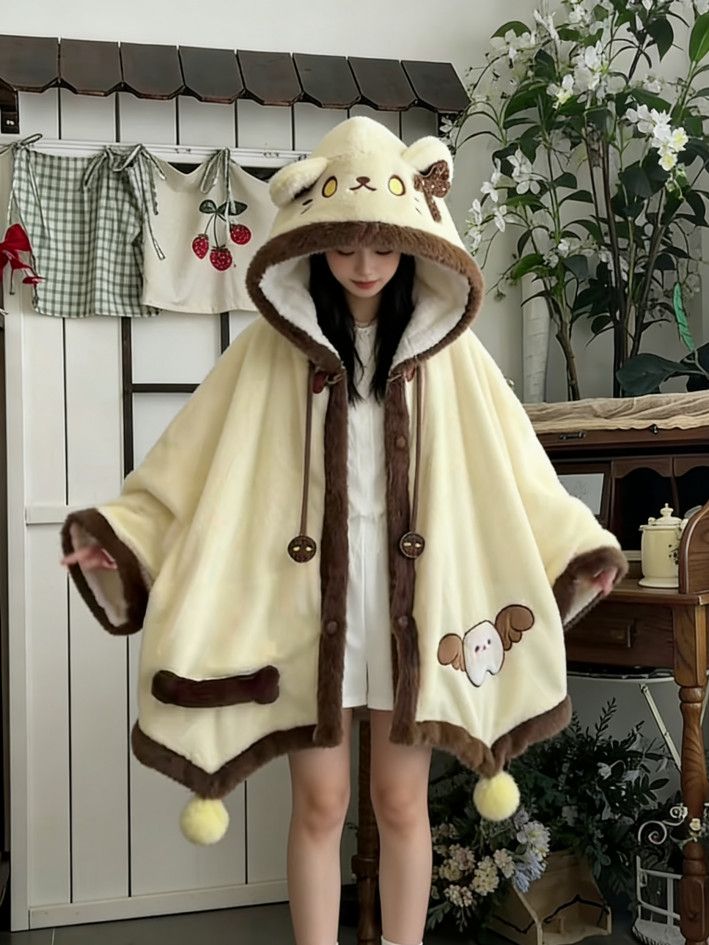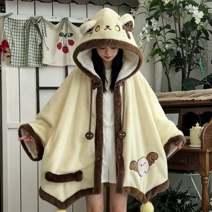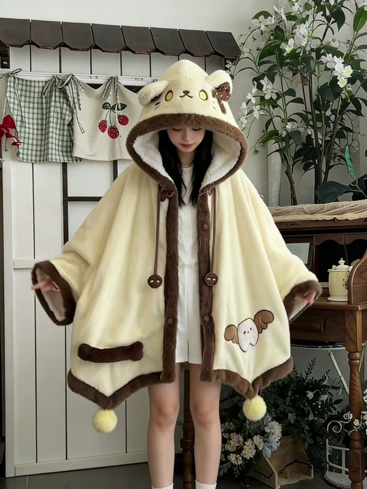 天使子猫甘々刺繍裏起毛フード付きケープルームウェア秋冬萌え系防寒パジャマ